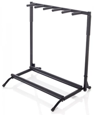 Professional foldable guitar and bass rack to hold 5 instruments. All contact parts between instrument and stand are rubber coated. Dimensions: 72,5 x 68,5 cm, weight: 2,5 kg. Color: Black.