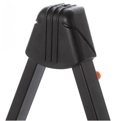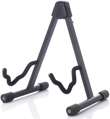 Lightweight versatile stand for any electric or acoustic guitar with ‘A’ frame equipped with pin that locks into the place and stabilizes the frame in one of 3 open positions. Stand is made of iron and provides great stability and durability. Its arms and the back-lodging are covered with injection-moulded soft rubber to improve the stable grip. Stand offers maximum opening of 34.5. Height: 41.5 cm. Weight: 1.4 kg. Black colour.