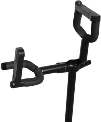 Ground steel stand for two guitars witch adjustable height from 70 cm to 95 cm. All the parts that are in touch with the instrument are specialy protected with a EVA rubber binding. The weight of the stand is 1,4 kg and it withstands by up to 20 kg. Colour: Black.