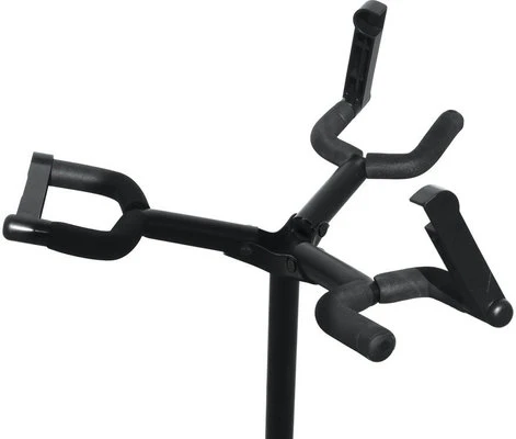 Ground steel stand for three guitars witch adjustable height from 70 cm to 95 cm. All the parts that are in touch with the instrument are specialy protected with a EVA rubber binding. The weight of the stand is 1,8 kg and it withstands by up to 20 kg. Colour: Black.