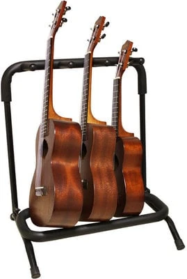 Metal supports for 3 Ukuleles. Realized to accommodate Ukuleles of different sizes. Parts in contact with the instrument are coated with a special material which avoids any chemical reaction with the painting of the instrument. Available in black color.