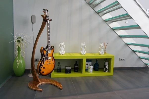 Dragon One is an exclusive wooden design guitar stand to show off your instrument. Made for a beautiful acoustic guitar, an exclusive electric or an eye-catching bass. For the finishing touch, choose your color woolfelt in our accessories section. Wood: AMAZAKOUE, Botanical name: Guibourtia ehie. Growth area: Tropical West Africa. Wood Description: The heartwood is yellowish brown to chocolate brown with grayish to nearly black stripes or flames. Features: New Exclusive Patented Design, AA Quality Woods, Nitrocellulose Safe, Perfectly Fits All Electric and Acoustic Guitars, Colorful felt options (see our accessories section). Specifications: Dimensions: Height: 117cm , Width: 45cm, Depth: 66cm. Maximum guitar length (from nut to bottom, guitar strap included): 104cm. Maximum instrument weight: 8 kg. Natural (silver) aluminum carrier inclusive. Finish: Natural