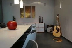 Dragon One is an exclusive wooden design guitar stand to show off your instrument. Made for a beautiful acoustic guitar, an exclusive electric or an eye-catching bass. For the finishing touch, choose your color woolfelt in our accessories section. Wood: PLANE (LACEWOOD), Botanical name: Platanus acerifolia. Growth area: Europe. Wood Description: The heartwood of plane trees is light brown and the wide sapwood is white to slightly reddish color. Dutch plane usually has a few clear blue glow, while the Belgian and French planes is whiter. Features: New Exclusive Patented Design, AA Quality Woods, Nitrocellulose Safe, Perfectly Fits All Electric and Acoustic Guitars, Colorful felt options (see our accessories section). Specifications: Dimensions: Height: 117cm , Width: 45cm, Depth: 66cm. Maximum guitar length (from nut to bottom, guitar strap included): 104cm. Maximum instrument weight: 8 kg. Natural (silver) aluminum carrier inclusive. Finish: Natural