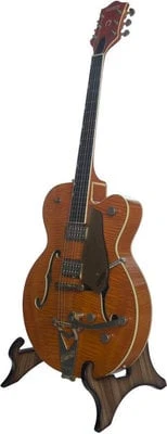 Mini Dragon wooden design guitar stand is a joy to use, safe, and elegantly stores your instrument in every room. AA quality woods perfectly combine with your guitar. High quality bumpers are provided to protect your instrument in places it touches the wood or to put under your stand for grip. Wood: ZEBRANO, Botanical name: Microberlinia bisulcata. Growth area: Tropical West Africa. Wood Description: The heartwood is yellowish in color with dark brown veins that run parallel to the axe. When the wood is quarter-sawn or cut, the famous zebra-like drawing appears where the wood gets its name. The brown veins occur at intervals of 5-10 mm and are 0.5-1.5 mm wide. Features: New Exclusive Patented Design, AA Quality Woods, Nitrocellulose Safe, Perfectly Fits All Electric and Acoustic Guitars. Specifications: Dimensions: Height: 40cm, Width: 35cm, Depth: 30cm. Maximum instrument weight: 10 kg. Finish: Sunburst