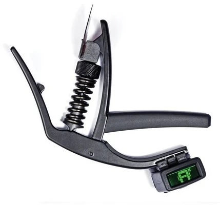 Capo from the NS Artist series for 6-string acoustic and electric guitars combined with microtuner NS Micro Headstock Tuner, which is mounted on the head of a guitar. Thanks to the patented Tri-Action geometric design capo is easy to use and provides an even loading of the strings. The tuner has a built-in piezo transducer that captures the vibration of the instrument and not the sound, thus enabling accurate tuning even in noisy environments. In addition, it features an universal three-color backlight LCD. The package also includes mounting parts.