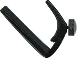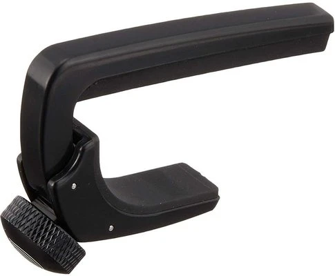 Capo that was designed specifically for classical guitars and other instruments with flat (non-radius) fingerboards and assures buzz-free, in-tune performance at any fret. A micrometer adjustment mechanism allows user to dial in the exact tension needed for the guitar, strings and playing position. This greatly reduces the need to retune the guitar during and after capo use. Moulded ABS construction offers lightweight ease-of-use, and superior functionality.