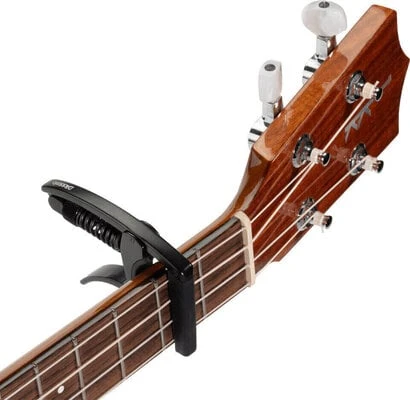The Tri-Action Ukulele Capo use a patented design to reduce the force required to open and close. This allows you to dial-in the perfect clamping tension, while eliminating the need to retune during use. The micrometer tension adjustment applies direct horizontal pressure, assuring uniform clamping tension regardless of neck profile. Built light and durable, the Tri-Action Uke Capo adds negligible weight to your uke, but can still withstand extensive gigging and travel. Designed in collaboration with Ned Steinberger.