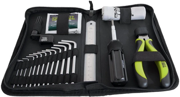 Tool kit. Features: Ernie Ball’s all in one tool kit is perfect for cleaning, maintaining and keeping your instrument in perfect playing condition. Change strings, set intonation, adjust the action, check string height and more. Tool kit includes Microfiber Polish Cloth, Wonder Wipes, Heavy Duty String Cutter, Peg Winder, 6-in-1 Screwdriver, Ruler, and durable Hex Wrench Set.