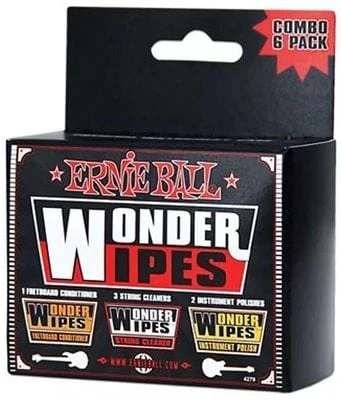 Instrument care kit. 6-pack of individually sealed instrument care wipes. Each box includes 1 pack of Fretboard Conditioner, 2 packs of Instrument Polish, and 3 packs of String Cleaner.