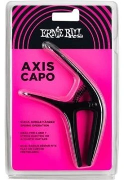 Guitar capo. The Ernie Ball Axis Capo’s ergonomic features allow for fast and accurate single handed key changes. A dual radius design conforms to flat or curved fretboards, ensuring buzz-free operation on 6 or 7 string electric and acoustic guitars. Our capo’s are made from aluminum and feature a lightweight rubber handle for comfortable operation.