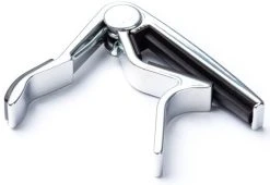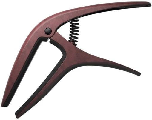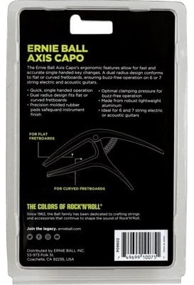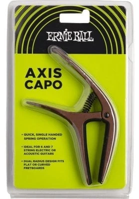 Guitar capo. The Ernie Ball Axis Capo’s ergonomic features allow for fast and accurate single handed key changes. A dual radius design conforms to flat or curved fretboards, ensuring buzz-free operation on 6 or 7 string electric and acoustic guitars. Our capo’s are made from aluminum and feature a lightweight rubber handle for comfortable operation.