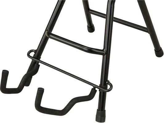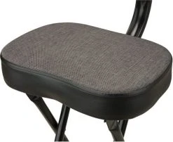 Ideal for any guitarist or bassist, this combination seat and guitar stand makes it easy to have a productive practice session or survive a long performance. Comfortably padded for long playing sessions, the seat and Fender 351 pick-shaped backrest with embroidered “F” logo are covered in woven gray tweed fabric. The flip-up/down instrument cradle—designed to fit most guitars and basses—displays your instrument securely while the integrated crossbar footrest accommodates almost any leg position. Designed for easy transport, the seat legs fold and the backrest is removable to make it even more compact when headed to a gig.