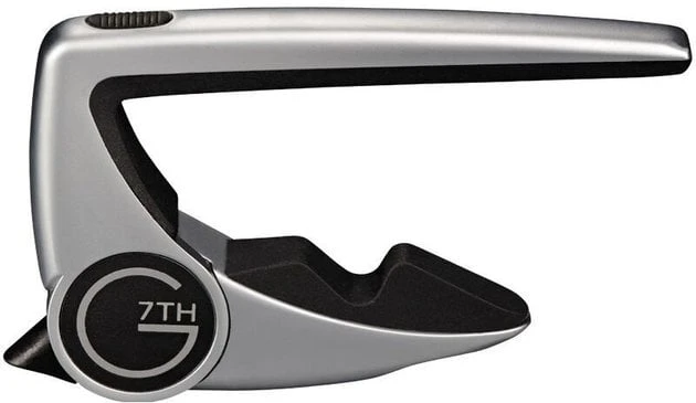 Simple capo that was specifically designed for classical guitars with the standard flat fingerboard that features the smaller, lighter, faster patented clutch mechanism for infinite one-handed adjustment with fast squeeze-on/squeeze-off action. It also features the unique Tension Control System that allows intuitive capo adjustment for setting the minimum tension needed. Capo is equipped with the inert silicone wrap around rubber, while internal design eliminates deadening of the tone and avoids metal-to-wood contact on the neck. It has also been designed to store behind the nut or on the peghead when not in use. Weight: 53 g. Silver colour