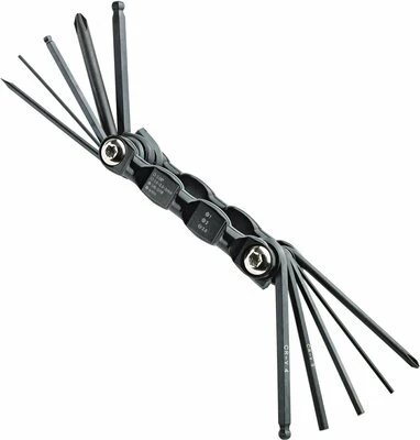 A versatile guitar tool, consisting of Allen keys, in inches (0.05″), inches with spherical head (1/8″ and 3/16″), metric (1.5 – 2.5 and 3 mm) and metric with spherical head (4 mm). Other tools included are two Phillips screwdrivers (Philips 1 and 2) and a 2.5 mm slotted screwdriver.