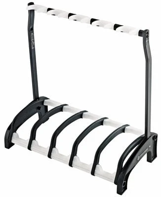 The Guardian securely holds up to 5 E-guitars or base guitars, saving space. Specially adjusted and cushioned instrument supports and the flexible protective arms provide a secure grip. The Guardian is easy to transport and carry thanks to an innovative folding mechanism. It can be stored in an upright position. The individual upper support brackets with integrated pick holders allow the guitars to be placed either on the right or left side, and also ensure that the guitar strings are not touched. For mobile use castors can be mounted optionally. The translucent (colorless) elements made of high quality Elastomer plastic are suitable for all kind of guitar lacquers, including nitro lacquer. Discoloration from the stand to the guitar does not occur. SpecsBase Dimensions: 688 x 335 mmHeight: 700 mmInstrument Support: non-marring plastic materialSize when folded: 688 x 670 x 173 mmSuitable for: Eelectric guitarsWeight: 4,7 kgSpecial FeaturesProtective bars prevent damage from bumps or knocking;holds the guitar’s neck without touching the strings;integrated pick holder