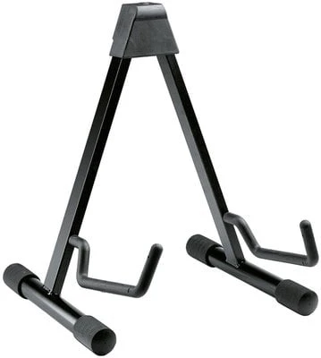 A-guitar stand. For acoustic guitars. Stable, sturdy, simple and easy to adjust and fold. Width adjusts from 220 to 350 mm. Support arms are covered with exclusive non-marring material to protect instrument finishes. Base width: from 220 to 350 mm. Height: 420 mm. Weight: 1,9 kg. Colour: Black.