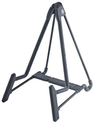 Stand for electric guitar with an improved support system, suitable for instruments of various sizes. Its steel construction with a slip-resistant and non-marring plastic surface can be adjusted to four different positions or to fold completely. The stand is made in black colour design. Dimension: when folded – 380 x 290 x 33 mm, height when using – 350 mm, adjustable width while using – 185-230 mm; weight: 1.32 kg.