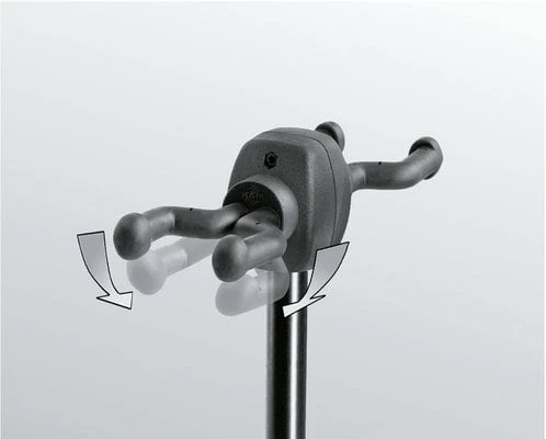 Double storage with Double! Wherever space is at a premium. The new stand for 2 guitars is proving very popular. Acoustic, electric or bass guitar – the patented hanger grasps the guitars firmly and securely. The firm grip is provided by the individual protectively covered moveable support arms. The large lobes on the holder ends prevent the guitar rotating or accidentally falling from the hanger. The large soft foam roll protects the body of the guitar and gives the stand its unique look. The stand folds quickly and compactly for transport. Base diameter: 760 mm. Height: from 800 to 1,300 mm. Weight: 2 kg. Colour: Black.