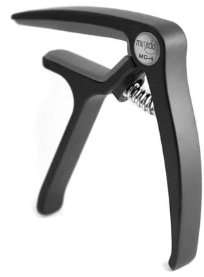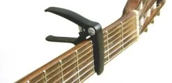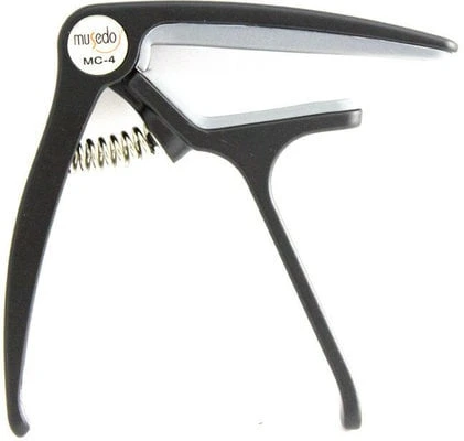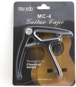 Capo that is designed specifically for the flat fret board of a classical guitar and allows for quick, effortless change of pitch. Its silicone foam pad is level and adjusts for all string tensions without damaging the finish or the fret board. The capo facilitates transposing of all keys without retuning the guitar. It has a strong but lightweight aluminium construction with steel springs for long lasting performance.