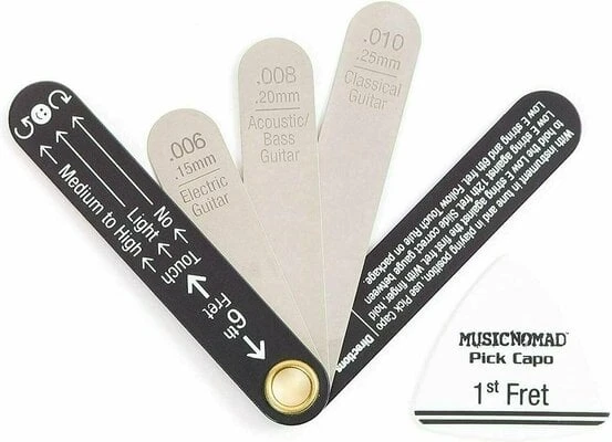 Being able to measure your neck relief is a critical step in the setup process. MusicNomad’s precision Truss Rod Gauge will help you do it quickly & accurately. The gauge comes equipped with the 3 most common relief measurements (.006β, .008β, .010β). Instructions printed right on the handle makes it extremely easy to dial in your neck relief. Itβs perfect for electric, acoustic, classical & bass guitars & features laser etched markings that take the guesswork out of which gauge to use for each instrument. Itβs made of premium stainless steel construction without the annoying, messy oil found on traditional feeler gauge sets. We even included an innovative pick capo to assist in the process. That’s MusicNomad quality β raising the bar in equipment care.