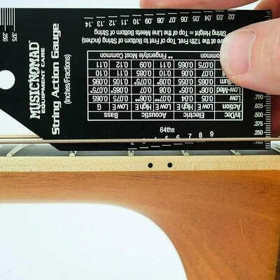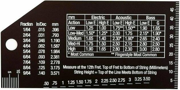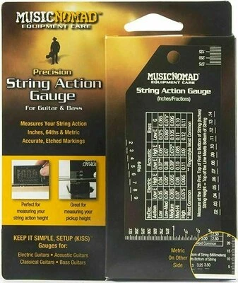 What if you could get accuracy, readability, quality & functionality in one string action gauge? Winner! Being able to measure your string action is a critical step in the setup process. MusicNomad’s patent pending precision String Action Gauge is packed with unmatched features & benefits. It starts with accurate measurements that are easy to read with the black finish contrasted with deep etched white markings. The high quality stainless steel design combined with numbers & lines that don’t rub off ensures years of use. We include measurements in inches, metric & 64ths to customize to your preference. Our convenient chart on proper height by instrument type takes out the guesswork. The pickup ruler helps you dial in your sound even more. And yes, designed with 4 different side lengths you can find the side that lays across 3 frets and use as a Fret Rocker to check if you have any uneven fret heights. That’s MusicNomad quality – raising the bar in equipment care.