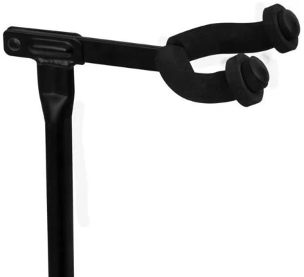 Guitar hanger that is designed to hang most standard guitars by their headstock and attaches to any base with standard M20 threading (base must be able to support the weight of hanger and instrument). Its height easily adjusts with an ergonomic cat’s-eye knob to accommodate for different sizes and styles of guitars and basses, while the upper yoke folds flat for easy storage and travel. Velveteen rubber end pieces keep the guitar from sliding off but will not harm the instrument’s finish.