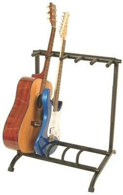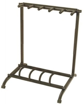 Foldable multi-guitar rack that allows for displaying up to five electric and acoustic instruments on stage, in the studio, or at home – they line up in single-file leaning against a padded yoke and cradled by a padded base. The wide rectangular base is stable in all conditions, while the backrest folds downwards allowing for easy transport. Height: 73.6 cm. Base spread: 63.5 x 51 cm. Folded dimensions: 63.5 x 76.2 x 15.2 cm.