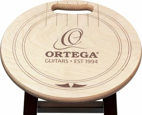 Solid wood barstool with Ortega soundhole design and comfortable carrying handle.