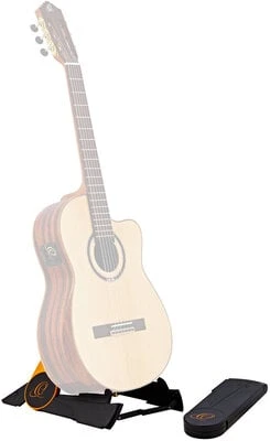 Ortega Portable Guitar Stand. The perfect solution for a “take-out” instrument stand. Fits all sizes of Guitars, Basses and many more. For electric and acoustic guitars. Great and easy use fold technique. Made with extremly lightweight and strong synthetic material. Color: Black/Orange.