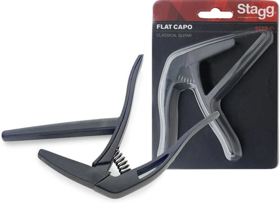Flat “trigger” capo for classical guitar, easy to use and adjust due its ergonomic shape, with rubber coating for improved protection against scratches. Black colour.