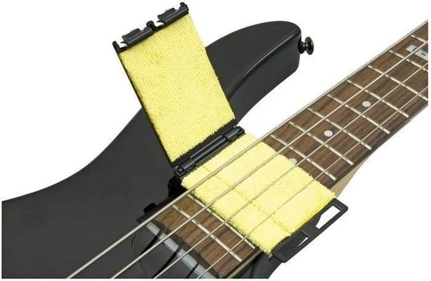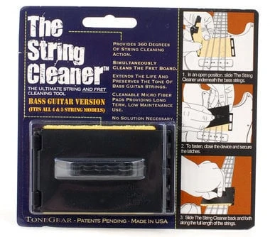 String cleaner for 4 or 5 string bass guitars with revolutionary design that provides 360° cleaning, removes oil, rust, sweat or dead skin and therefore extends the life of the strings and preserves their tone qualities. Cleaner is equipped with microfiber pads with porous sections for long-term low-maintenance use: after use, just run them under warm water with a drop of liquid soap or dishwashing liquid and gently massage the dirt out. Pads need to be dry before the use and no special liquid solution is necessary. Also, extended microfibers on the bottom of the device simultaneously clean the fingerboards (can be used on both fretted and fretless basses).
